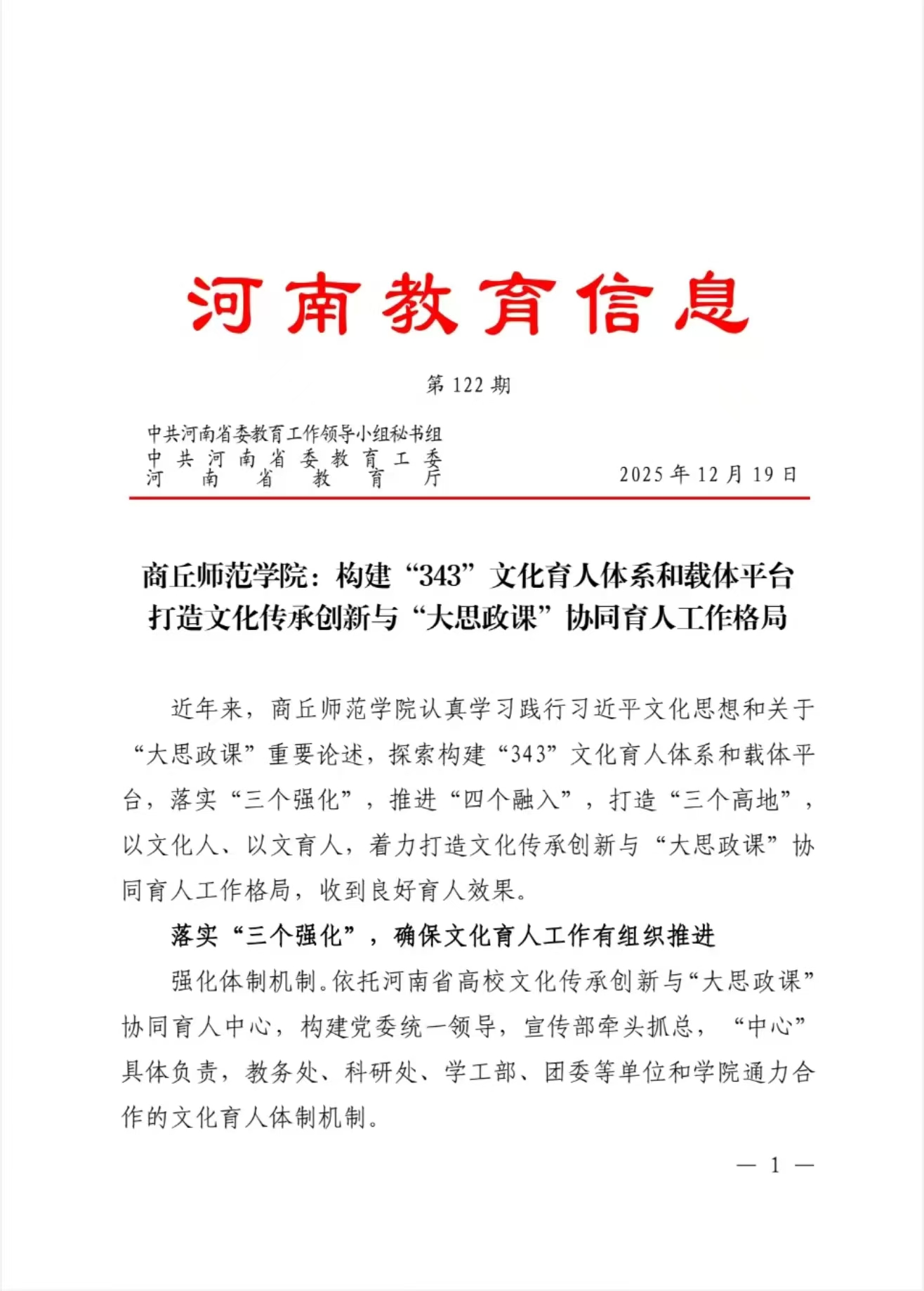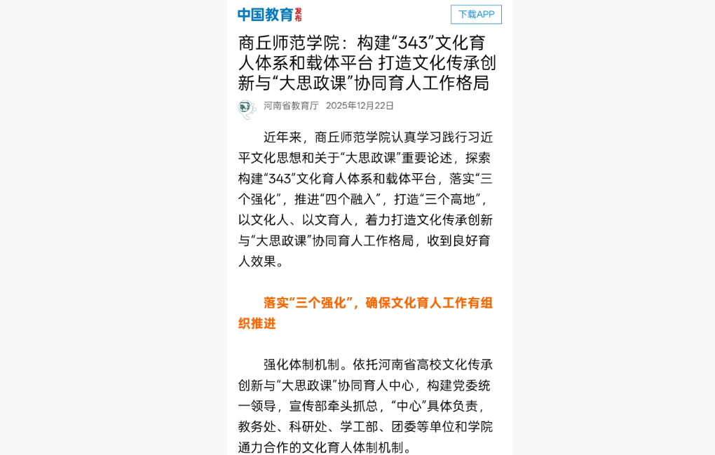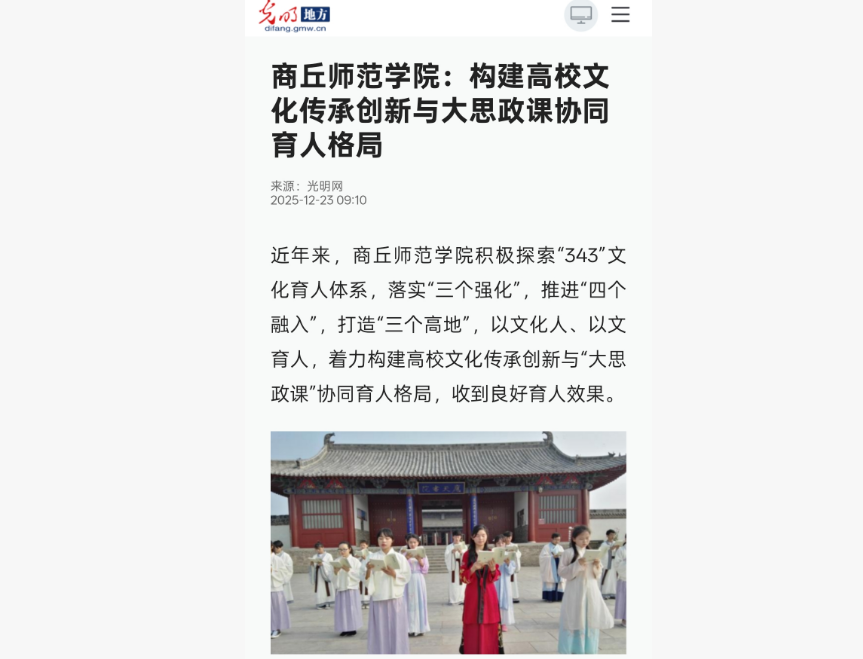《经济日报》、光明网、《河南教育信息》等多家媒体刊发刘国庚署名文章《构建高校文化传承创新与大思政课协同育人格局》。文中指出,近年来,商丘师范学院认真学习践行习近平文化思想和关于“大思政课”重要论述,探索构建“343”文化育人体系和载体平台,落实“三个强化”,推进“四个融入”,打造“三个高地”,以文化人、以文育人,着力打造文化传承创新与“大思政课”协同育人工作格局,收到良好育人效果。社会反映良好。